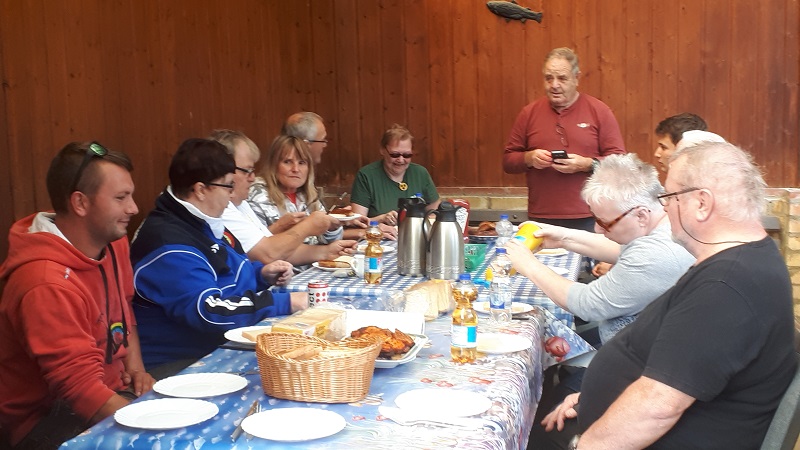 Es folgte ein gemeinsames Mittagessen, zu dem deftiges Grillgut und verschiedene Getränke gereicht wurden. Die dabei geführten Gespräche bezogen sich auf die Fangerfolge des Tages und so mancher der Anwesenden berichtete auch über zurückliegende Fangergebnisse des Jahres. Bei diesen Berichterstattungen war sicherlich das ein oder andere hinzugefügte Anglerlatein nicht auszuschließen.