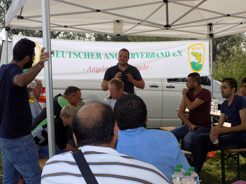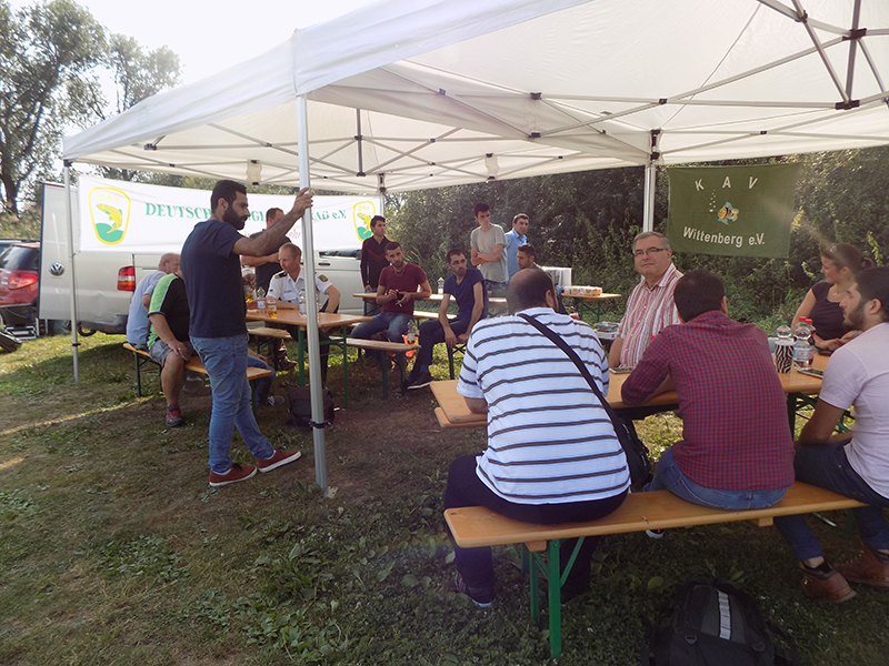 Der Einladung folgten 15 interessierte Asylbewerber, die bei herrlichem Sonnenschein mit dem Fahrrad zum Gewässer „Durchstich“ in Pratau kamen. Die Mitglieder der KAV Wittenberg e.V. organisierten 2 Pavillion, Bierzeltgarnituren Getränke und nahmen die Männer, vorrangig syrischer Herkunft herzlich in Empfang.