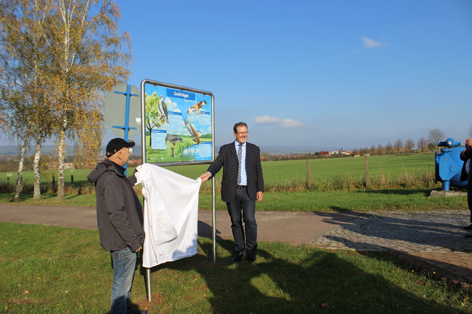 Und so benötigte die komplette Umsetzung des Erdachten einen weiteren Kalenderdurchlauf, um nun am Freitag unter prominenter Teilnahme eröffnet werden zu können. Fünf Aufsteller, davon vier doppelseitig, geben nach Themen geordnet, ihre Informationen dem interessierten Besucher preis. Nicht nur zur Freude der „Macher“ gab die Eröffnung des Naturlehrpfades, die der Staatssekretär im Umweltministerium, Herr Klaus Rehda, gern übernahm die Möglichkeit, im Anschluss auch über aktuelle Fragen bei der Erarbeitung der NATURA 2000 Landesverordnung zu diskutieren. Denn neben dem Staatssekretär, waren auch der Direktor des LHW, Herr Burkhard Henning und der Leiter des Umweltamtes des Landkreises Mansfeld-Südharz, Herr Hooper, der Einladung gefolgt. Stolz auf das Erreichte, aber bereits die zukünftigen Herausforderungen fest im Blick, so das Credo einer angeregten Diskussion an diesem Nachmittag. Dass diese noch länger anhalten und an Intensität bis zur Verabschiedung der Natura 2000-Landesverordnung zunehmen wird, darüber waren sich alle einig.