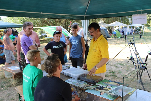 Frank Tetzlaff, Inhaber des ältesten Angelgeschäftes in Halle stand als Fachhändler ebenfalls für unseren Jugendlichen bereit, alles rund ums Karpfenangeln zu erklären. Die neusten Montagen, erprobte Ruten und Rollen, eine fachgerechte Präsentation, gepaart mit einem ungeheuren Erfahrungsschatz, fanden die volle Aufmerksamkeit der Teilnehmer. Selbst Funktionäre und Betreuer staunten bei einigen Demonstrationen nicht schlecht und zeigten sich voller Anerkennung und Respekt über vermitteltes Fachwissen. Und die breite Palette der großzügig zur Verfügung gestellten Lockstoffe, wird wohl in naher Zukunft so manchen Karpfenangler wohl eher in die Rolle eines Parfümeurs, als eines Boilie-Kochs schlüpfen lassen.