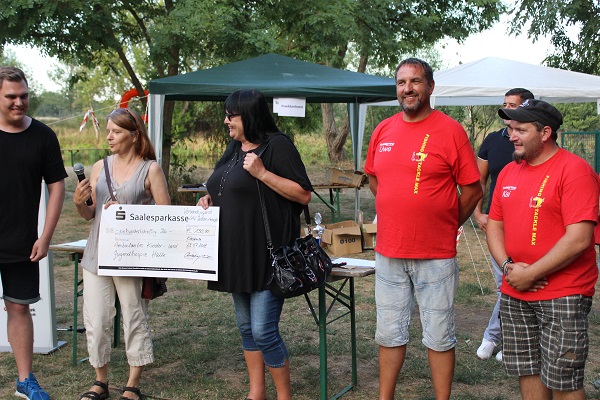 Mit den Stationen „Vielseitigkeit“, Skisch, Dart, Klappfisch, Eierlaufen, Gummistiefel-Weitwurf und „Anfüttern“, stand eine Vielzahl von Anlaufpunkte bereit, das eigene Geschick zu erproben. Und so breit wie das Angebot, stellte sich am Abend auch die Liste der Sieger und Platzierten dar. Präsidenten Uwe Bülau, der sich bereits am Nachmittag über das Lagerleben informiert hatte, nahm mit weiteren Ehrengästen und Sponsoren die Ehrungen der Gewinner mit der Verbandsjugendleitung vor. Gleichzeitig überreichte die Verbandsjugend an das Ambulante Kinder- und Jugendhospiz in Halle einen symbolischen Scheck der Verbandsjugend, zur Unterstützung der verantwortungsvollen Arbeit mit diesen Kindern.