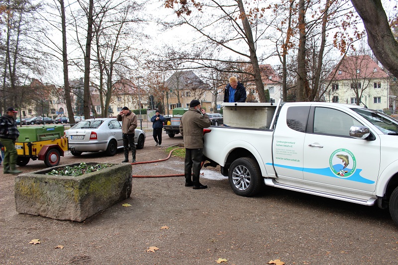 Das dieser gemeinsame Beitrag Wert geschätzt wird, zeigt sich auch in personeller und medialer Resonanz. Mit Herrn Arno Heilemann und Herrn Reinhold Sangen-Emden aus dem Umweltministerium waren nicht nur hochrangige Staatsdiener zugegen, sondern sie legten selbst bei der „Aussaat“ eines Stückes Zukunft symbolisch mit Hand an. Das auch MDR, Volksstimme und DPA berichten, freut auch Norbert Schetzke und Gerhard Wurche aus Zerbst. Umsichtig und vorsichtig wählen sie geeignete Stellen im zugewiesenen Flussbett aus, um die wertvolle Fracht auszubringen. Dabei geht es ihnen nicht um den schnellen Erfolg. Den erzielen jetzt schon andere. Aber in absehbarer Zeit auch einmal einen Lachs fangen und genießen zu können, ist Ansporn und Schlüssel für das Grundprinzip von Schutz und Nutz.