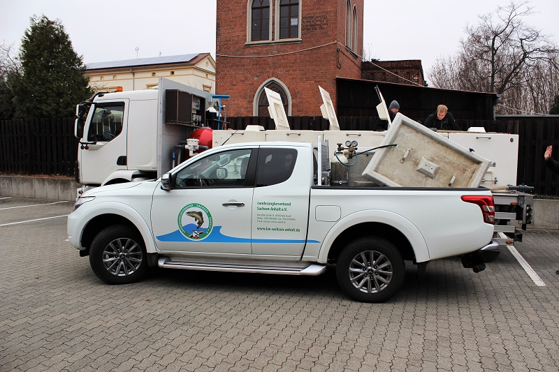 Bild: Junglachse werden vom LKW aus Dänemark auf Einsatzfahrzeuge verteilt
