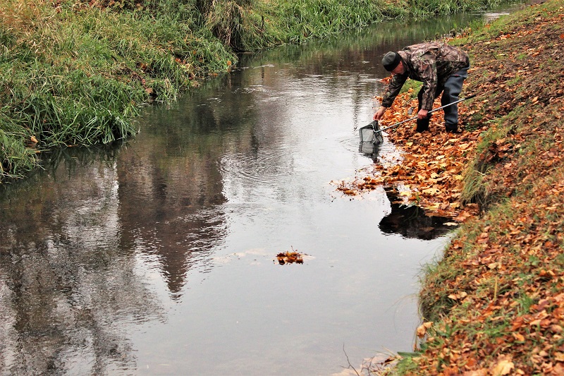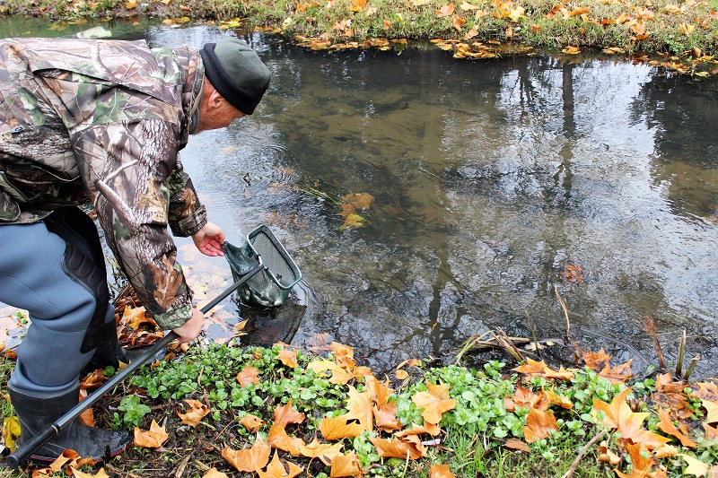 Bild: Norbert Schetzke bringt Junglachse vorsichtig im Gewässer aus