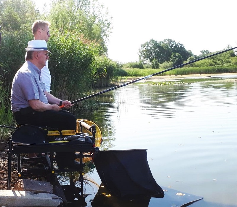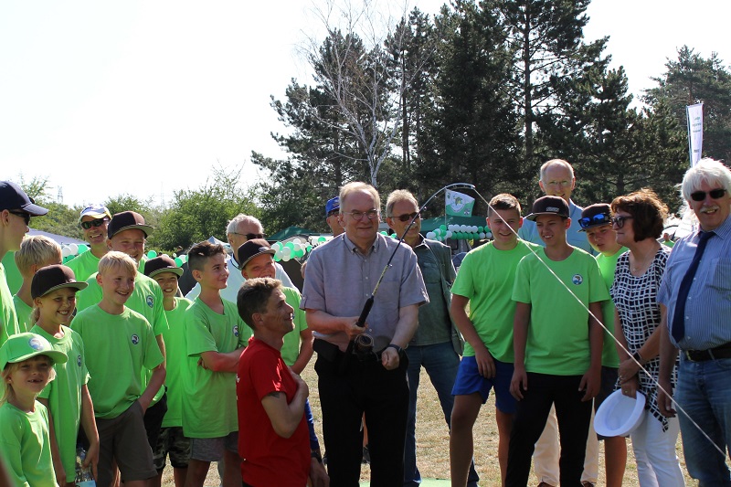 Beim anschließenden Rundgang durch das Camp, bei dem er alle 11 nach Themen geordneten Stationen unter dem Titel „Meister ihres Fachs“ besuchte, kam es zu vielen Gesprächen, die auch für Angler unerfreuliche Entwicklungen, wie am Goitzschesee bei Bitterfeld berührten. Zu spüren war das ernste Interesse an Problemen der Angler und die hohe Wertschätzung für die „Kunstfertigkeit“ der Spezialisten, die zugleich als Pflege und Weiterentwicklung eines uralten Kulturgutes zu werten ist. Offensichtlich davon inspiriert, nahm er unter Anleitung von Weltmeister Johannes Böhm direkt am Wasser auf einer Sitzkiepe Platz und die Angel in die Hand. Letzte Besichtigungsstation war das Räuchern. Nach einer kleinen Probeverkostung von Spezialitäten aus dem nach Buchenholz duftenden Ofen, endete der ausführlichen Rundgang. Mit einem herzlichen Petri Heil wurden die Gäste aus dem Jugendcamp verabschiedet.