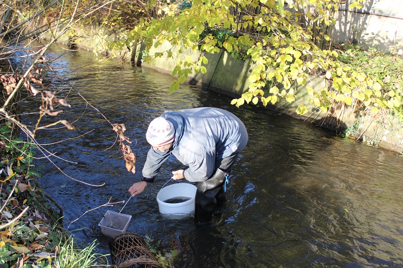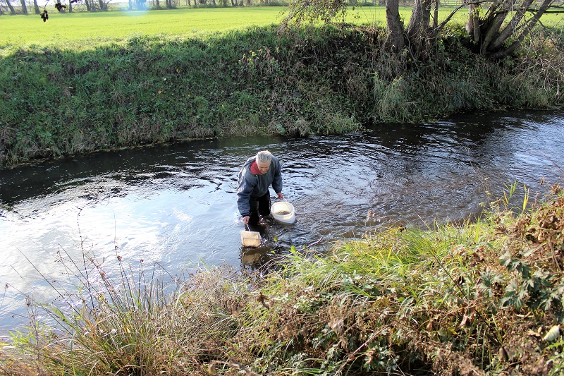 Bild: Frank Weichler vom Institut für Binnenfischerei setzt umsichtig und vorsichtig die Lachse an geeignete Stellen im Flussbett der Nuthe aus