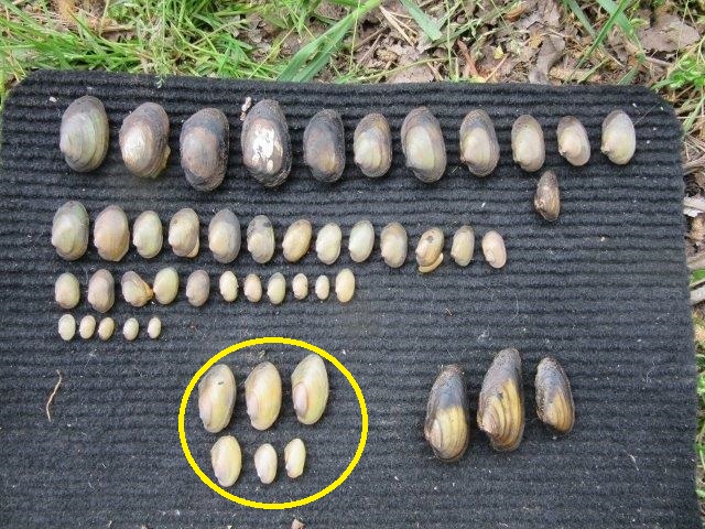 unten links 6 Abgeplattete Teichmuscheln, davon: zweijährige Tiere = 2; dreijährige Tiere = 1, vierjährige Tiere = 3