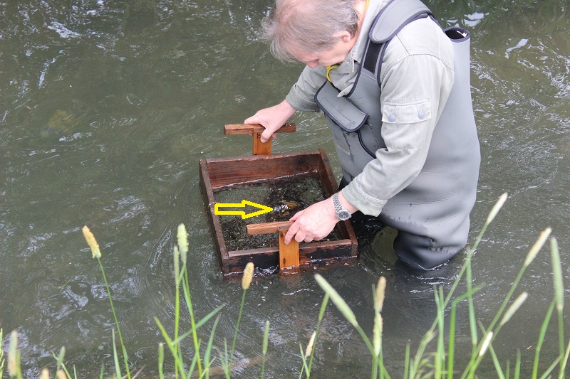 Nicht zum Schluss förderte die Untersuchung auch noch eine Sensation zu Tage. Erstmals konnten die Fachleute den Nachweis der „Abgeplatteten Teichmuschel“ mit 6 Exemplaren erbringen (Bild mit gelben Kreis). Nicht nur das ihr Vorkommen damit in der "Kleinen-Helme" in Sachsen-Anhalt einmalig ist, auch ihr Vorkommen in diesem Lebensraum ist nicht unbedingt typisch. Eigentlich, so wissen die Experten zu berichten, sind ihr angestammter Lebensraum die größeren Fließgewässer, wie Unstrut, Saale und Elbe. Dort kommen sie als Einzelexemplare in den Tiefen der Flussläufe vor. Sie wird in der Roten Liste Deutschland in der Kategorie 1 (als vom Aussterben bedroht) geführt.